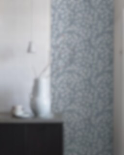 Tapeten Liv pryds av ett folkloristiskt bladverk i modern tolkning. Ett vackert, slingrande mönster av ljusa, stiliserade blad med inslag av blått och grått mot en blekt dimblå botten. Det diskret melerade trycket ger mönstret en vacker patina.Liv är en mångsidig, hemtrevlig tapet som gör sig lika bra i barnrum och sovrum som vid matplatsen, soffgruppen eller hemmakontoret. Samma mönster finns också i två andra färgställningar.