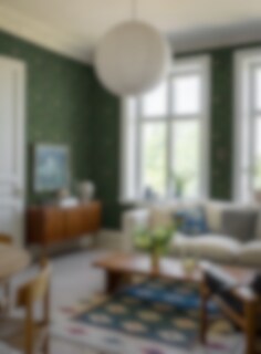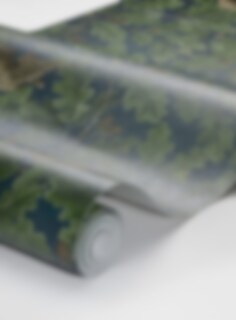 Tapeten In the Oak pryds av den mäktiga ekens varmt gröna lövverk och vackra ekollon. Tittar du noga upptäcker du också ett 20-tal insekter i mönsterbilden. Visste du att en enda ek kan husera 1000 olika djurarter? Med denna tapet på väggen fylls hela rummet av skogens lugn och livskraft. Mönstret är målat i akvarell för att sedan tryckas som tapet i 2 färgställningar. Här ser du In the Oaks vackra grönska på en mörkblå, lite melerad botten.