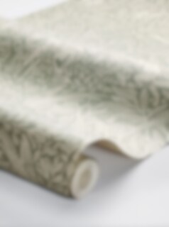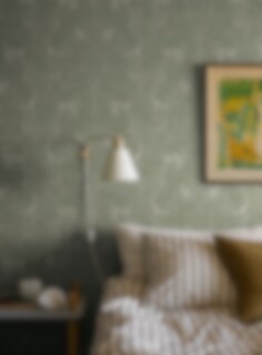 Under the Elder Tree är en mönstrad tapet som passar både stora och små. På håll bildar fläderns täta lövverk en lugn, enhetlig yta. Tittar du närmare upptäcker du lekfulla detaljer, som den stolta kronhjorten och fasanerna som flyr räven i hagtornsbusken. Motivet är som en liten berättelse, inspirerad av skogen men också av Arts & Crafts och medeltida gobelänger. Tapetens limtrycks i fem färgställningar. Här ser du den i grågrönt och ljusbeige.