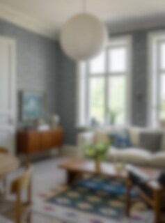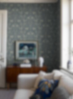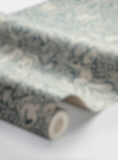 Tapeten Under the Elder Trees mönster är inspirerat av såväl Arts & Crafts, medeltida gobelänger och vår svenska natur. En frodig mönsterbild där en och annan överraskning gömmer sig i fläderns täta, mytomspunna lövverk. På håll bildar mönstret en lugn, enhetlig yta. Tittar du närmare ser du kronhjorten, fältharen och fasanerna som flyr rödräven. Tapeten limtrycks i fem färgställningar, här med pudrigt mörkblå botten och ljust gråbeige detaljer.