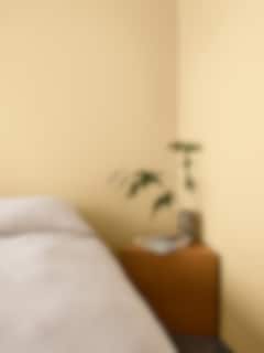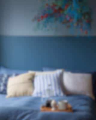 Lyckes kulörer Lapsis Lazuli (mörkblå sänggavel) och Azure Blue (vägg) är två lite mörkare blå färger som skapar ett lugn i rummet.