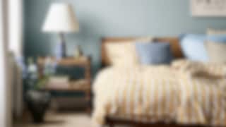 Väggarna i det här sovrummet är målade med LADY Pure Color i kulören 1775 Fresh Pasta och 7236 Chi.