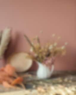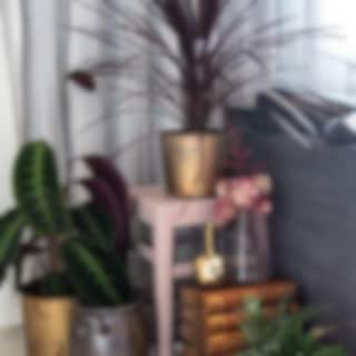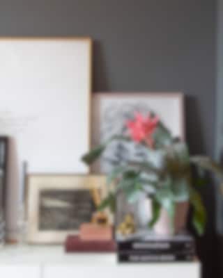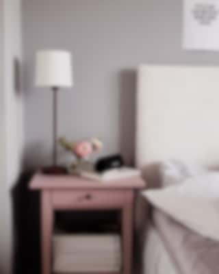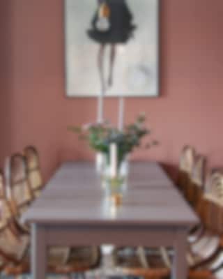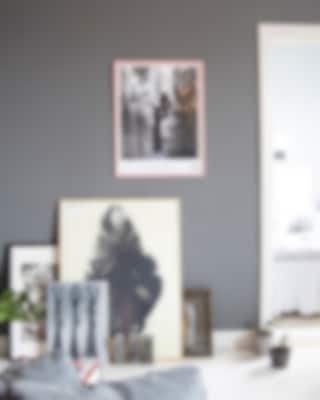 När Emma flyttade in i lägenheten målades den om genomgående i lila och rosa nyanser med mycket svärta, men efter två år blev hon sugen på något nytt. Emma provade en handfull grå kulörer innan hon landade i sitt beslut. Det blev en mörk neutral grå i vardagsrummet. I sovrummet, där även taket målades, blev det en ljusare neutral grå kulör. Köket och matplatsen är målade i rosa och brända kulörer i olika nyanser. Färgen vid matplatsen var från början tänkt till vardagsrummet men efter att jag provmålat upptäckte jag att den passade bättre i matrummet, berättar Emma.
