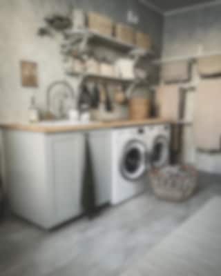 Tvättstugan är tapetserad med tapet från Midbec nr 802122 som tyvärr inte finns längre men liknande tapeter finner man från Midbecs kollektion Kalk. Skåpet i badrummet är målat i kulören NCS S6005-G50Y.