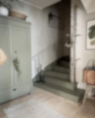 Trappen och skåpet är målade i kulören NCS S4010-G70Y och väggarna är målade med kalkfärgen (kalklitir) San Saccaria.