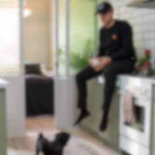 – Vi provmålade inte utan föll för kulören direkt. Kulören blir alltid lite mörkare när man får upp den på väggen än vad den upplevs på färgprovet, men vi är riktigt nöjda, lägger Arvid till samtidigt som han hoppar upp på köksbänken och lyfter upp mopsen Theo i knät.