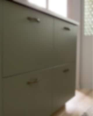 Den grå kulören kombineras med en naturlig grön ton (8253 Green Harmony) på skåpluckor och stommar i köket.