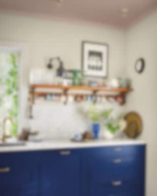 Färgstarka blå köksluckor målade med Beckers kulör Euforisk. Här har man vågat sätta färg på taket som är målat i kulören Rofylld. Väggarna är målade i kulören Harmonisk. Båda från Beckers.