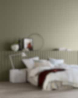 Dämpat och gyllene grönt i sovrummet. I bild målat i Lady Supreme Finish 8302 Lagerträd från Jotun. Foto: Jotun. Handla färg från Jotun Lady här.