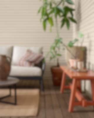 Fasaden är målad i kulören 1939 Sandbeige och bänken är målad med Jotuns fönster- & snickerifärg för utomhusbruk i kulören 20118 Amber Red.