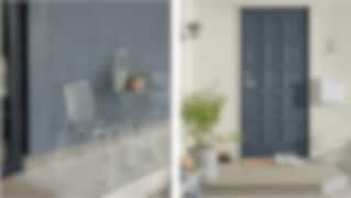 Husfärger på bilderna: till vänster DEMIDEKK Infinity i kulören Delicate Blue. Till höger, dörr målad med DEMIDEKK Infinity Details i samma kulör.