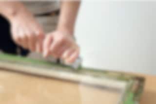 Nu är det dags att maskera glaset innan du börjar måla fönster. Använd maskeringstejp för utomhusbruk och placera tejpen ungefär en millimeter från kittets kant. Detta gör att färgen täcker både kittet och en liten del av glaset, vilket förhindrar att vatten tränger in mellan glaset och kittet. Avsluta med att skruva tillbaka hörnbeslagen. Sedan är det dags att måla.