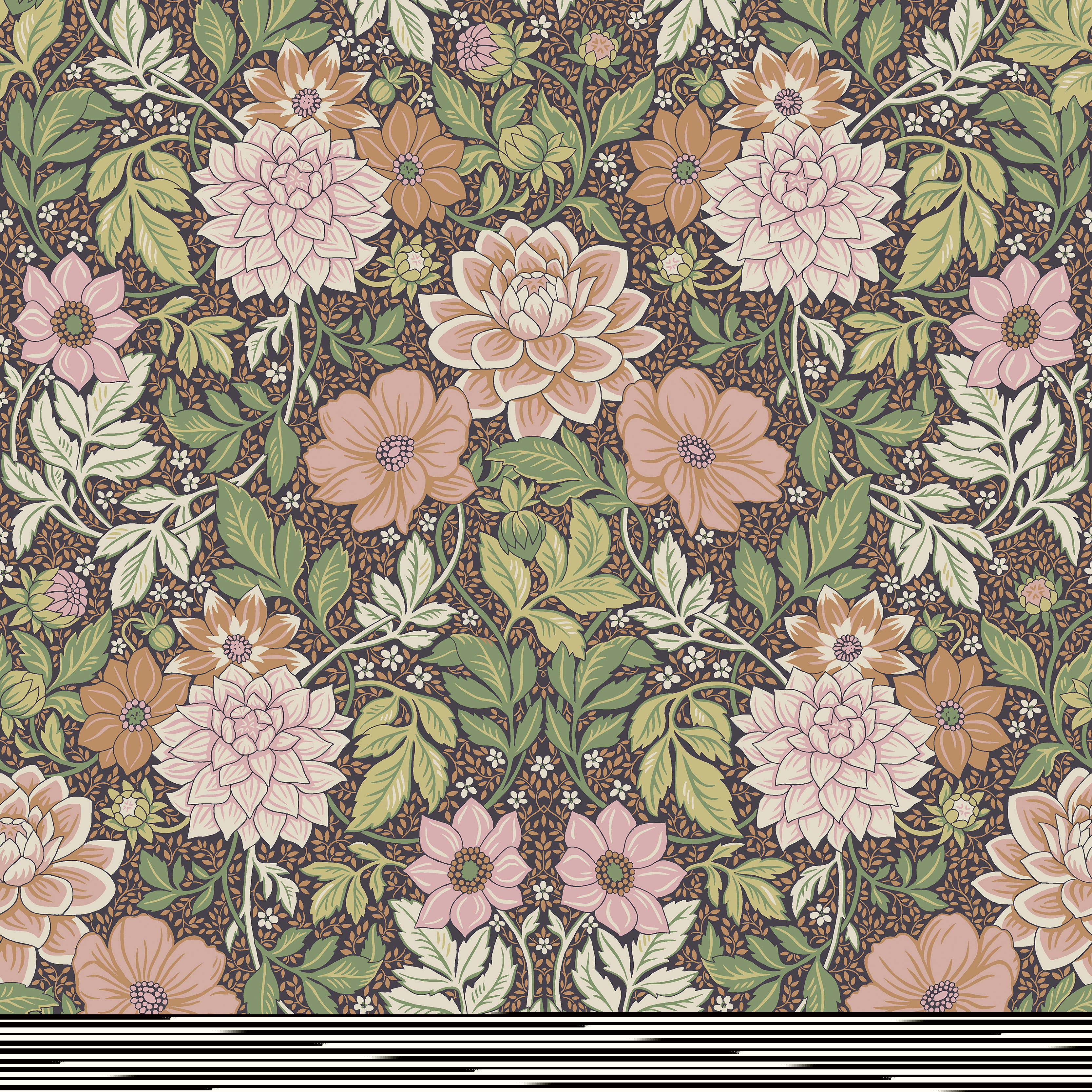 Här ser du Dahlia Garden i en naturalistisk och frisk färgställning med toner av rosa, creme, ljus rost och prunkande grönt mot en mörk botten.