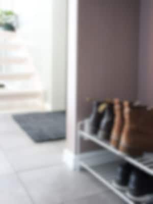 När vi ändå körde färgfest i hemmet så passade vi på att måla hallen i den rosa kulören Delightful Pink från Jotun. De matchade både tapeten och Minty Breeze-kulören. Det är en kul detalj att vi valde att måla in både hatthylla och stång till galgarna.