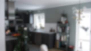Halva öppna vardagsrummet med kök och hall lät vi måla i en halvmatt Minty Breeze-kulör från Jotun som går åt gröngrå hållet.