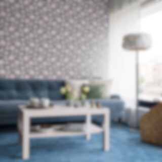 Lycke Nyponros är en stormönstrad och tät tapet med vackert blomstermönster. Tapeten finns i fem olika färgställningar, här ser du den på en petrolfärgad botten med mönster i ljusrosa, gråbeige och vitt.