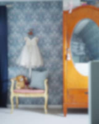 Vid en första anblick i hemmet får vi känslan av att villan är äldre än från 1975. Michaela har hittat en perfekt balans mellan eklektisk vintage och modern skandinavisk inredning, vilket har gett 70-talsvillan en själ. Här bor hon i en härlig tapetdröm tillsammans med sin familj. I barnens rum, Michaelas ateljé samt i hallen sitter noga utvalda tapeter som passar med husets äldre stil, med snedtak, träpaneler i taket och gluggfönster med fönsterbrädor i marmor.