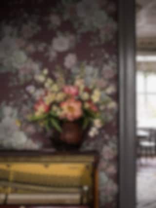 Floral Charm från Boråstapeter med sina förtrollande handmålade blommor på en burgundy botten.