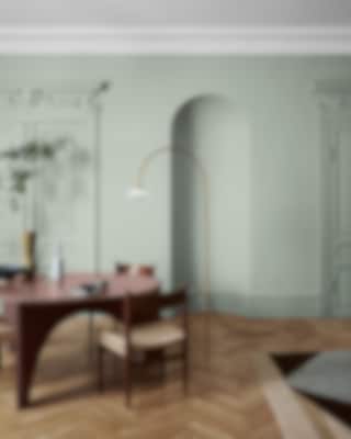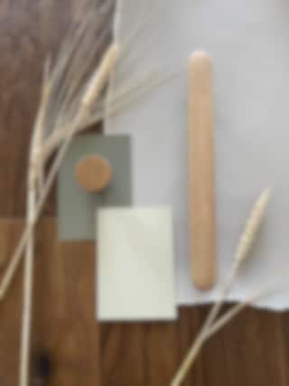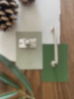 Lyckes gröna kulör Pistachio Green med ljusa Morning Dew och greige Monsoon ihop med detaljer i ek.