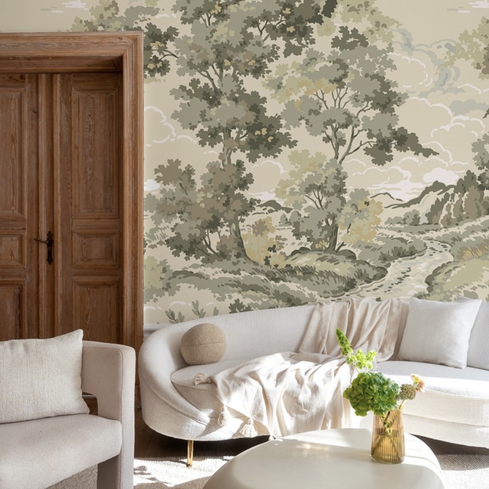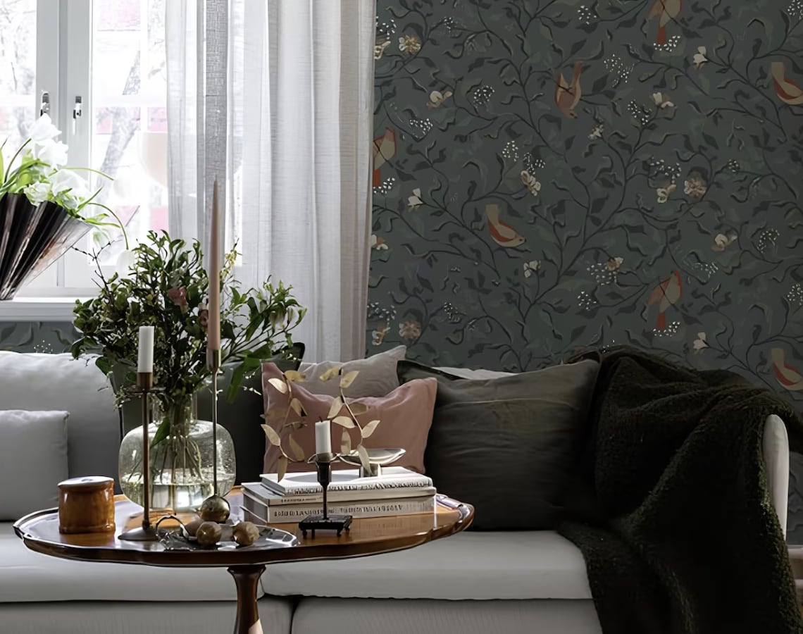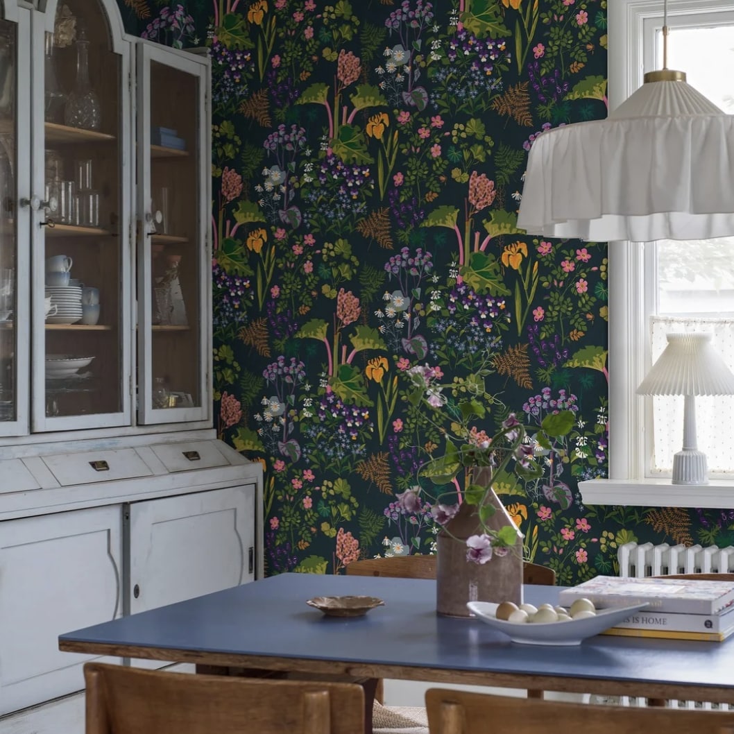 En av de starkaste tapettrenderna 2026 är naturmotiv. Botaniska tapeter, organiska former och mönster inspirerade av skog, trädgård och landskap skapar lugn och harmoni i hemmet. Färgskalan går i gröna, jordnära och dämpade toner som passar perfekt i nordiska hem.