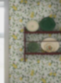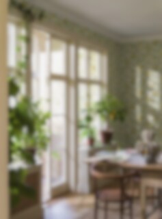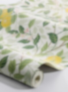 Tapeten Citronträd är prydd med vackra citroner i ett slingrande bladverk, handmålat av Jenny Hahne Gadd och inspirerat av Arts & Craft-rörelsens rika mönsterbilder. Mönstret är livfullt men skänker en harmonisk känsla till rummet. Här ser vi tapeten i en ljus färgställning med bladverk i gröna toner, följt av solgula citroner och cremevita blommor med inslag av rosa på en äggskalsvit botten.