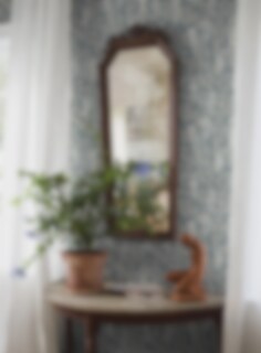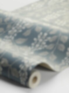 Blåregn är en blommig tapet med ett handmålat mönster av blåregnsklasar och slingrande bladverk. Det sirligt luftiga mönstret skapar en lugn och ombonad atmosfär i rummet. Här presenteras tapeten i en sober ton av blått med blomblad i beige och blomklasar i vitt och beige. Limtrycket ger den matta ytan ett rustikt och levande uttryck.