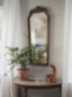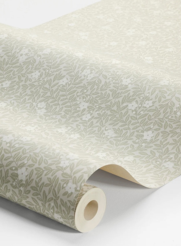 Myrten är en småmönstrad tapet med ett tätt, handmålat mönster av myrtens slingrande bladverk och dess små vita blommor. Denna charmiga och dekorativa tapet skapar en lugn och ombonad atmosfär i rummet. Gör sig utmärkt i sovrum, hall och vardagsrum – gärna i kombination med bröstpanel. Här ser vi Myrten i en ljus behaglig färgskala med khakigröna blad, cremefärgade blommor mot en gråbeige botten.
