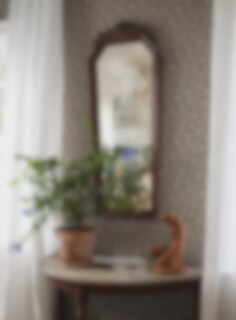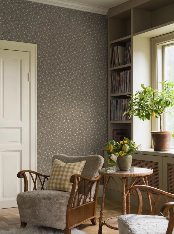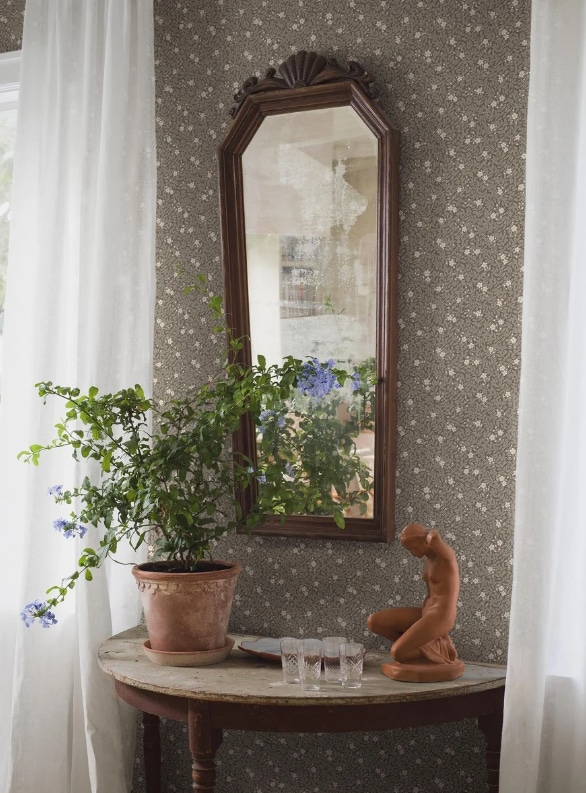 Myrten är en småmönstrad tapet med ett tätt, handmålat mönster av myrtens slingrande bladverk och dess små vita blommor. Denna charmiga och dekorativa tapet skapar en lugn och ombonad atmosfär i rummet. Gör sig utmärkt i sovrum, hall och vardagsrum – gärna i kombination med bröstpanel. Här ser vi Myrten i en dämpad grön färgskala med khakigröna blad, ljusbeige blommor mot en olivgrön botten.