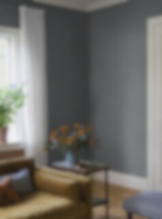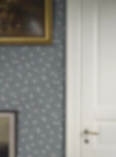 Myrten är en småmönstrad tapet med ett tätt, handmålat mönster av myrtens slingrande bladverk och dess små vita blommor. Denna charmiga och dekorativa tapet skapar en lugn och ombonad atmosfär i rummet. Gör sig utmärkt i sovrum, hall och vardagsrum – gärna i kombination med bröstpanel. Här ser vi Myrten i en dämpad blå färgställning med silvergröna blad, ljusbeige blommor mot en vilsam blå botten.