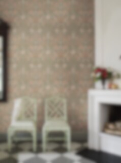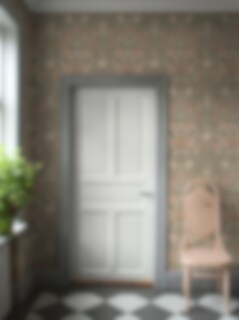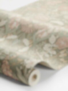 Tapeten Örtagård är en rikt dekorerad blommig tapet med ett spegelvänt mönster handmålat av Amanda Nordblad. Inspirerad av Arts & Crafts som kombinerar tapeten på ett tidlöst och samtidigt nutida uttryck med sitt täta mönster av prunkande vallmo, nyponros och andra läkeväxter, vilket skapar en elegant och ombonad känsla i rummet. Här ser vi Örtagård i en dämpad färgställning med pudriga nyanser av rosa, grönt, gult och cemevitt på en varm botten i dämpat olivgrönt. Limtrycket ger den matta ytan en rustik känsla och härligt liv.