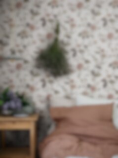 Tapeten Marion's Mural har ett blommönster i dämpade nyanser av rosa, beige och grågrönt. Blomslingorna är målade i akvarell för att sedan tryckas på en mjukt vävmönstrad botten. En levande, harmonisk tapet för lugna, ombonade rum. Denna tapet gör sig bra på rummets alla väggar! Marion's Mural finns i tre färgställningar. Här ser du den blommiga tapeten med benvit botten.