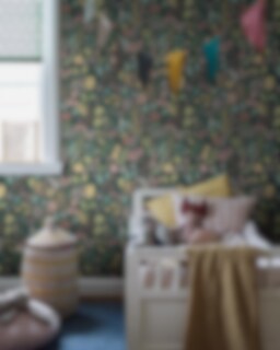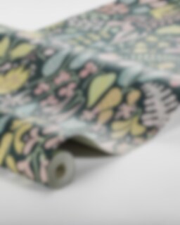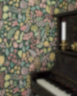 Den blommiga tapeten Herbarium har ett färgglatt, frodigt mönster som ritades av tusenkonstnären Stig Lindberg redan 1947. I samarbete med Stig Lindbergs familj har vi kompletterat Herbariums tidigare färgställningar med nya, lite dovare färgskalor.Här ser du tapeten Herbarium i en helt ny färgställning med mörkgrön botten och mönster i dämpade, lite pudriga nyanser av rosa, grönt och gult. Tapeten finns också i två andra färgställningar.