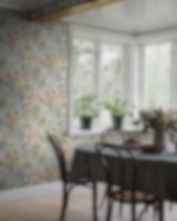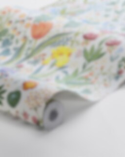 Noomi Spanges blommiga tapet Blomsterhav pryds av ett överflöd av blommor och bär från hennes föräldrars vildvuxna trädgård. Ett par vilda favoriter som humleblomster och stormhatt från närbelägna Sundbornsån har också letat sig in i denna prunkande högsommardröm. Tapeten finns i tre färgställningar. Här ser du Blomsterhav med krispigt vit botten och mönster i rena, starka nyanser av bland annat grönt, blått, gult och rött.
