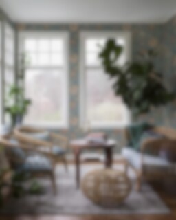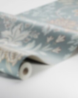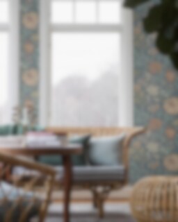 Den blommiga tapeten Alicias vackra mönster målades för hand av Sissa Sundling 2015. Ny trycker vi det i fyra vackra färgställningar vara två är helt nya. Här ser du Alicia i härliga allmogetoner som för tankarna till Dalarna. Det storblommiga mönstret går i mustiga men lite dämpade nyanser av bland annat gult, rödbrunt, ljusblått och grågrönt. Botten är mjukt dimblå, och drar en aning åt grönt. En levande, ombonad och rofylld tapet som gör sig lika bra i sovrum och barnrum som i mer sociala utrymmen.