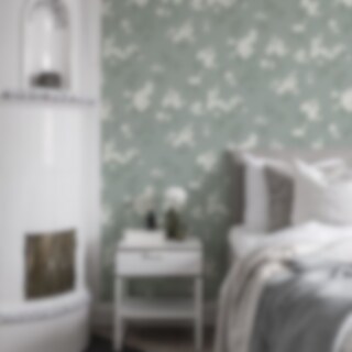 Karin tecknades när äppelträden blommade. Inspirationen kommer från känslan av picknick under blommande träd, själva tanken att det är maj och att hela härliga sommaren väntar. Så småningom kommer träden att bära äpplen men ännu är det långt kvar! Vi tar en klunk hallonsaft och njuter av tapeten i dess fyra färgställningar. Den blå drar lite mot grönt, den gröna är klassisk och lugn. Den ljusgrå är neutral och den mörkgrå glimmar till med guldinslag.