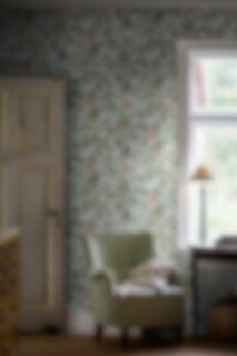 Den ljusa tapeten Ingrid Marie har ett ljuvligt mönster som speglar äppelträdet från de första spirande blommorna till kart, solmogna äpplen och bladverkets vackra skiftningar på hösten. Mönstret är handmålat i gouache av Boråstapeters designer Jenny Hahne Gadd och tryckt med traditionellt limtryck för ett levande uttryck. Här ser du Ingrid Marie med vit botten och mönster i pudriga nyanser av rostrött, ljusrosa, blekgult och olika nyanser av grönt. Finns även med mörkblå botten.