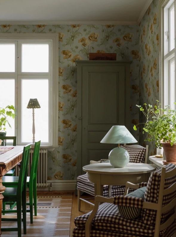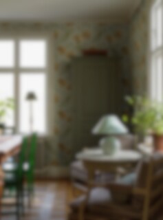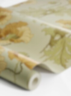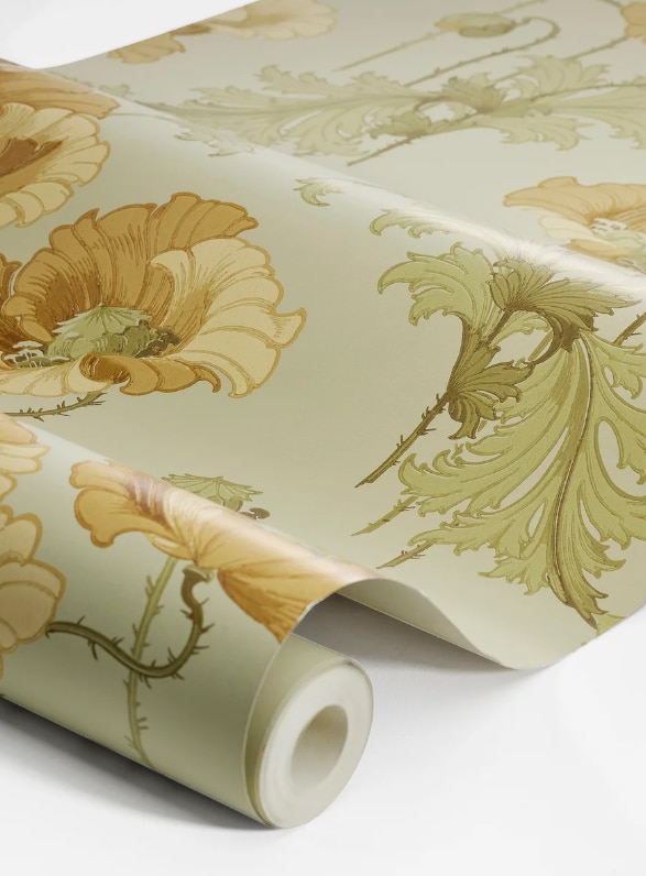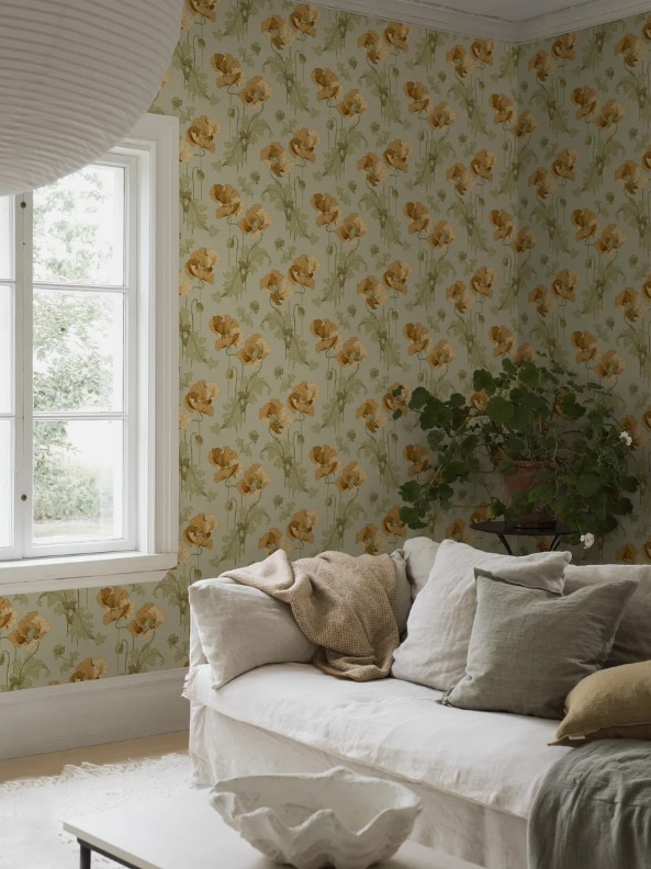 Den storblommiga tapeten Vallmo presenteras här i en mjuk och varm färgskala med känsla av klassiska linoljefärger. Det mildgröna bladverket samspelar vackert med blommor i sandgult och guldockra mot en ljusgrön botten. Originalet från tidigt 1900-tal trycktes i en liknande färgställning.