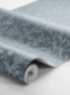 Den mörka, grönskande tapeten Florian är återskapad från ett original i vårt historiska tapetarkiv. Skira, stiliserade blommor och blad på en mjukt melerad botten. En elegant, klassisk och tidlös tapet i skandinavisk stil – fin i både moderna och mer traditionella interiörer. Här ser du tapeten Florian i en mörk, ombonad färgskala: gråblå blommor och blad på en dovt mörkblå botten. Mönstrets detaljer ger väggen ett levande uttryck, samtidigt som helheten känns lugn och harmonisk.