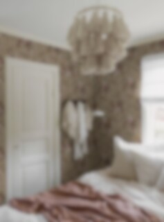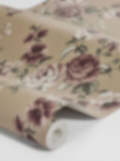 Nomi är en klassisk, blommig tapet med löst sammanhållna rosenbuketter slingrande över en enfärgad, mjukt patinerad yta. Det rofyllda, romantiska mönstret är skapat av Newbies designstudio och influerat av forna tiders tapeter men också av möbeltyger. Här ser du tapeten Nomi i en lite dovare färgskala, med rosor i mustiga toner av vinrött och rosa bland grågröna blad på en dämpat gyllenbrun botten.