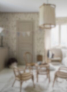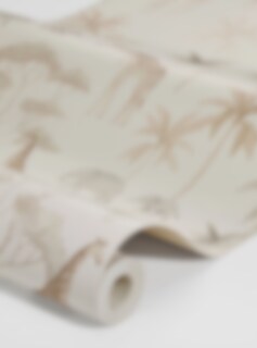 På den ljusa barntapeten Savannah vandrar giraffer och elefanter sida vid sida under savannens ståtliga palmer och skulpturala akacior. En ljus, luftig mönsterbild som inspirerar till härliga dagdrömmar och mysiga godnattsagor och ger rummet en ljus, ombonad atmosfär. Mönstret är designat av Newbie och trycks i deras milda, finstämda färgskala. Här ser du tapeten Savannah i naturtoner som linne, grått och gyllenbeige på en ljust sandfärgad botten. En varm, ljus färgställning med milda kontraster.