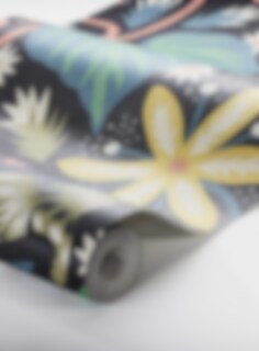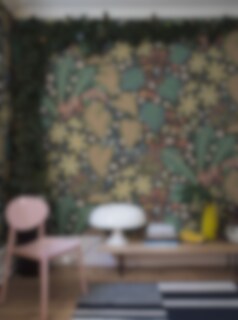 Hanna Wernings tapet Zingkorre pryds av ett storskaligt botaniskt mönster med små ekorrar som skuttar fram och tillbaka bland vackra blommor och blad. Inspirationen kommer från en liten ekorre som Hanna ser varje morgon utanför sitt köksfönster. Ett myllrande men harmoniskt mönster med många vackra detaljer. Zingkorre finns i två färgställningar. Här ser du tapeten i mustiga toner av till exempel grönt, gult och rost mot en mörk, grönsvart botten.