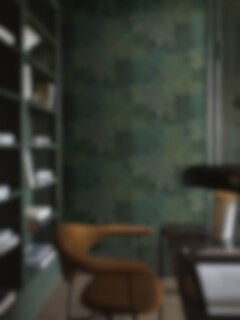 Mörka, eleganta tapeten Velvet Leaves har gröna, stiliserade blad lager på lager mot svart botten. Mönstret är inspirerat av djungelns växtkraft och med denna tapet kan du verkligen klä ditt rum i maffig grönska! Fin i vardagsrum men också i till exempel arbetsrum för bibliotekskänsla med djungel-touch. Velvet Leaves passar på rummets alla väggar, men kan också kombineras medtapeten Wild Ferns. Velvet Leaves finns även i fyra andra färgställningar.