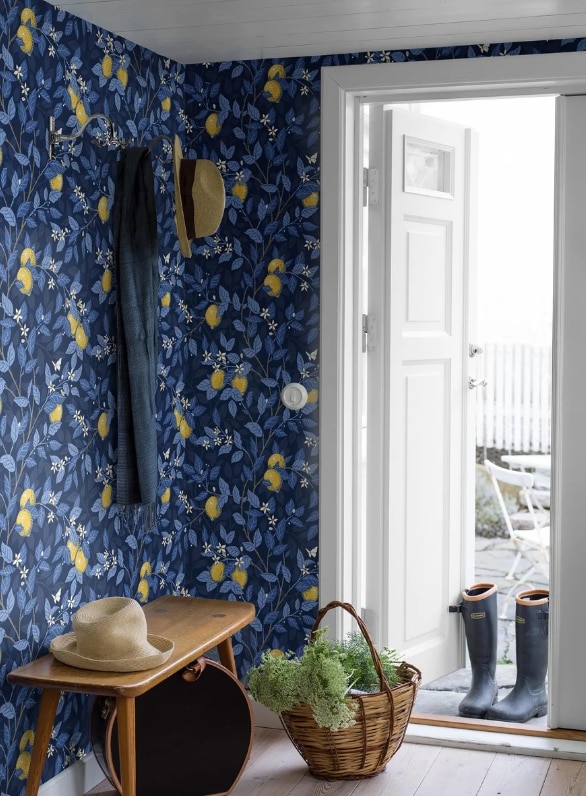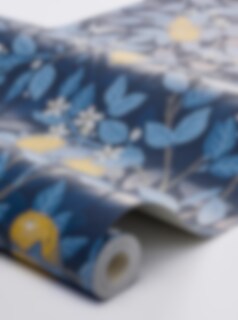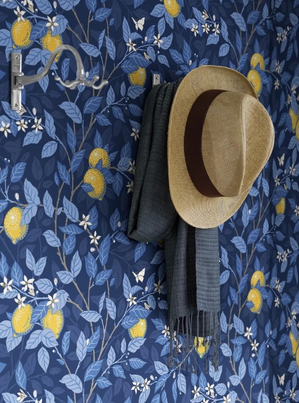 Tapeten Citronträd är prydd med vackra citroner i ett slingrande bladverk, handmålat av Jenny Hahne Gadd och inspirerat av Arts & Craft-rörelsens rika mönsterbilder. Här ser vi tapeten i en mörkblå färgställning med ljusblått bladverk följt av solgula citroner och vita små blommor på en mörkblå botten.