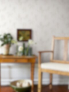 Tapeten Ulricehamn är starkt influerad av 1920-talets art déco-trend. Strikt stiliserade blomrankor samsas med stramt geometriska former och i bakgrunden skymtar ett nedtonat raster som ger tapetens fond extra liv. En riktigt stilig tapet, lika fin i dag som då. Ulricehamn finns i fyra olika färgställningar. Här ser du den ljusaste av dem, med crémevit botten och detaljer i grått och blänkande guld.