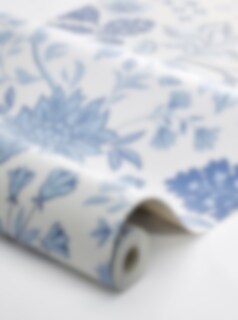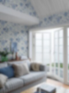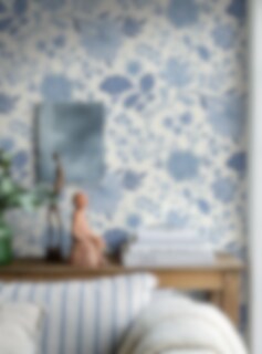 Här ser du den blommiga tapeten Alicia i en ny färgställning med härliga blå toner på en cremevit botten. Det storslagna blommönstret målades för hand av Sissa Sundling 2015 och limtrycks för ett levande uttryck med genuin karaktär. Alicia finns i fem varianter som passar hemmets alla väggar.