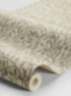 Tapeten Olivträd pryds av handmålade, beigebruna olivkvistar med blålila oliver mot en mild gulgrön botten. Den täta mönsterbilden ger rummet en hemtrevlig och rustik känsla. Nora Tysklinds design har inslag av Arts & Crafts, men färgsättningen känns samtidigt mycket modern. Tapeten passar därför väl in i klassiska interiörer som i moderna hem. Det traditionella limtrycket ger dessutom tapeten en vacker och levande yta.