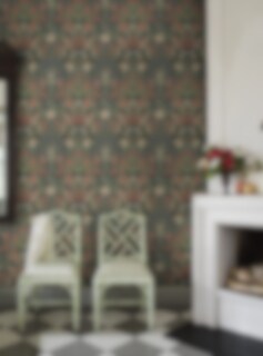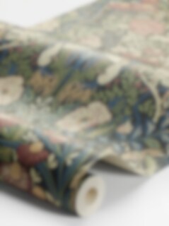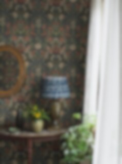Tapeten Örtagård är en rikt dekorerad blommig tapet med ett spegelvänt mönster handmålat av Amanda Nordblad. Inspirerad av Arts & Crafts som kombinerar tapeten på ett tidlöst och samtidigt nutida uttryck med sitt täta mönster av prunkande vallmo, nyponros och andra läkeväxter, vilket skapar en elegant och ombonad känsla i rummet. Här ser vi Örtagård i en färgpalett av rika toner i vinrött, blått, olivgrönt, havregult och cremevitt mot en nästan svart bakgrund. Limtrycket ger den matta ytan liv och djup.
