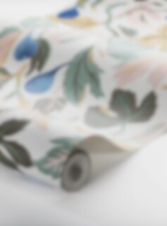 Den härligt stormönstrade tapeten Figs är designad av Petra Börner. Hon är känd för livfulla, stiliserade mönster som detta, med mjukt rundade fikon i ett frodigt, levande bladverk. Originalmönstret skar Petra ut för hand med skalpell i flera lager papper. Nu trycker vi mönstret som tapet i fyra olika färgställningar. Här ser du Figs i en blond, lite vårlik färgskala med mönster i lena toner av blått, rosa, grönt och ockragult mot cremevit botten. En ljus tapet som känns både lugn och livlig.