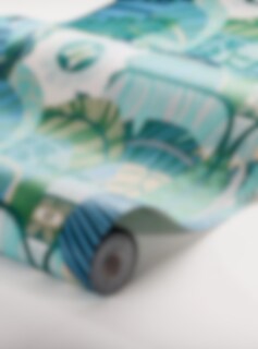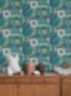 Den grafiska tapeten Hypnotic Safari har ett abstrakt, psykedeliskt mönster med rundade, organiska former och här och där ett öga som kikar fram. Originalet skapades av Petra Börner och Please! Magazine 2012, och mönstret har sedan tryckts på allt från tyg till pappersprodukter. Nu blir det tapet Tapeten Hypnotic Safari finns i tre olika färgställningar med helt olika uttryck. Här ser du den i varma, glada nyanser av grönt, blått och beige. Glittrande hav eller frodig djungel är frågan?