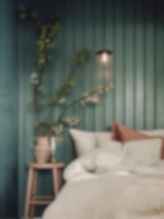 Panel målad i Lycke Perfekt Petrol och sängbord/pall målad i Lycke Mocha.